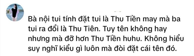 Theo đó, một tài khoản mạng xã hội đã chia sẻ câu chuyện đặt tên của chính mình, thu hút sự chú ý từ nhiều người. Cô gái cho biết, lúc chào đời được bà nội đặt tên là Nguyễn Thu Tiền. Tuy nhiên, bố của cô đã kịp thời ra cơ quan và được nhân viên tư pháp sửa thành tên mới, chỉ bỏ dấu thành Thu Tiên.