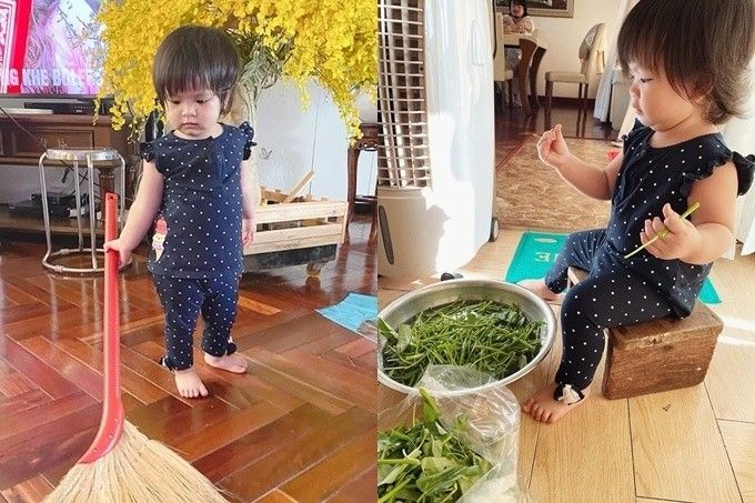 "Tôi luôn quan niệm dù là con trai hay con gái cũng phải làm việc nhà. Nếu là con gái, đó sẽ là một thiếu nữ đảm đang, được mọi người yêu thương. Ban đầu là các công việc đơn giản như dọn đồ chơi, quét nhà... Cả mẹ và con cùng làm với tinh thần vừa làm vừa chơi để bé hứng thú với công việc", người phụ nữ quyền lực đứng sau hàng loạt chân dài cho biết.