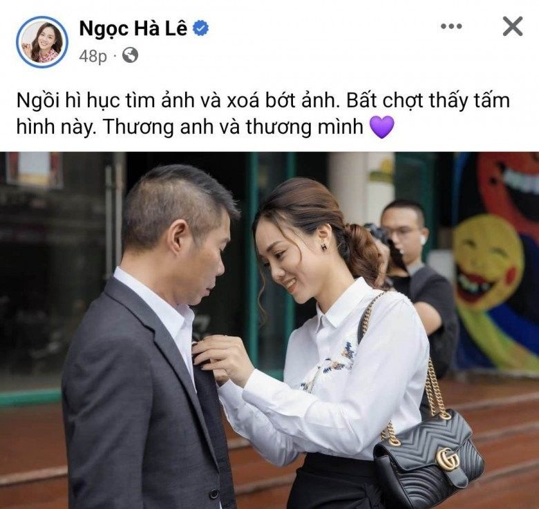 Trên trang cá nhân mới đây, vợ NSND Công Lý chia sẻ lại hình ảnh đang chỉnh áo cho chồng. Vừa chỉnh áo, Ngọc Hà vừa mỉm cười hạnh phúc. Kèm theo ảnh, cô viết: "Ngồi hì hục tìm và xoá bớt ảnh. Bất chợt thấy tấm hình này. Thương anh và thương mình".