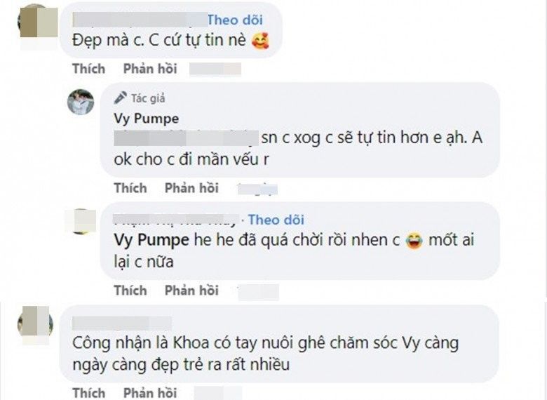 Từ trường hợp của bà xã Mạc Văn Khoa, chị em lại nhận được bài học ý nghĩa, dù bận rộn với việc kinh doanh cùng chồng và chăm sóc bé Minnie, Vy Pumpe vẫn không bỏ quên bản thân. Nhiều chị em cũng thường để dành việc nâng ngực sau khi thực hiện xong kế hoạch sinh nở vì nâng ngực sẽ ảnh hưởng ít nhiều tới sức khỏe và chất lượng sữa của mẹ.