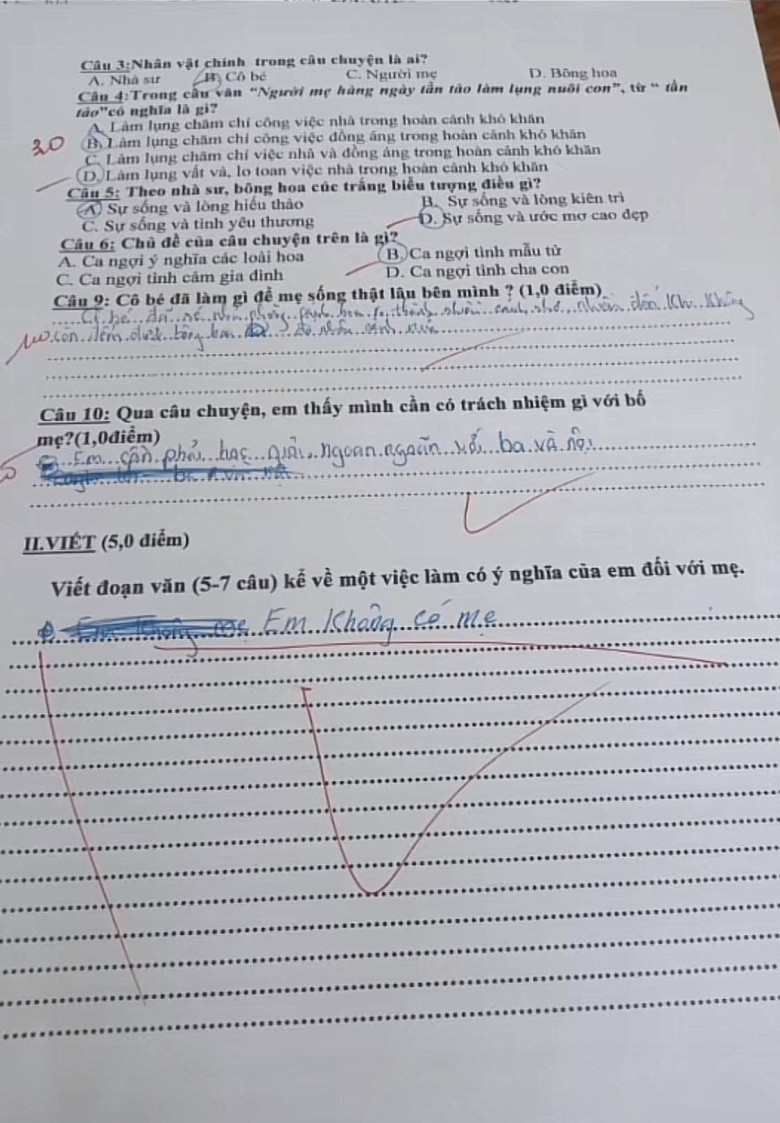 Những bài kiểm tra Văn học không chỉ là công cụ đánh giá kiến thức, mà còn phản ánh tình cảm, suy nghĩ và hoàn cảnh của các em học sinh. Cũng nhờ đó mà thầy cô giáo, cũng như gia đình có thể hiểu hơn và tiếp cận được gần hơn với thế giới bên trong trẻ, biết bé ra sao, như thế nào để hỗ trợ khi cần thiết.