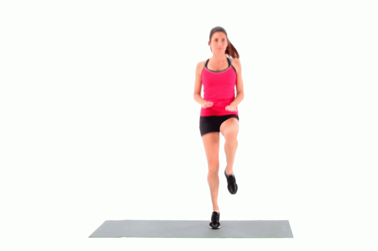 Chạy tại chỗ với sự tham gia của các cơ vùng lõi và co bóp cánh tay. Mục tiêu là giữ cho đầu gối cao và duy trì tư thế đứng thẳng khi tăng tốc thật nhanh.