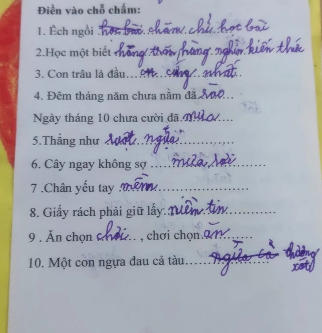 Cách đây không lâu, một bài tập điền từ, hoàn thành đúng những câu thành ngữ của học sinh cấp 1 đã khiến cộng đồng mạng không khỏi thích thú, sự sáng tạo “bá đạo” của đứa trẻ là điều mà không ai ngờ đến.