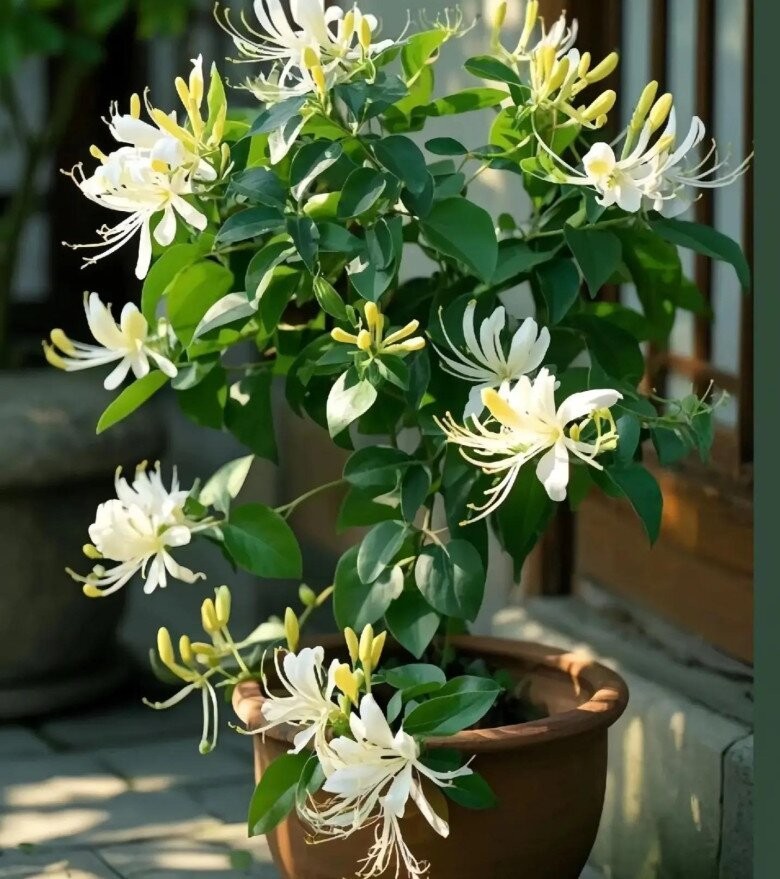Kim ngân hoa có dây leo phát triển nhanh, chỉ cần đủ nắng là có thể phủ kín giàn và nở rộ. Cây chịu hạn, chịu bóng tốt, rất phù hợp với người ít thời gian chăm sóc. Nụ hoa tươi có thể trộn gỏi, mang hương thơm nhẹ và vị giòn lạ miệng.