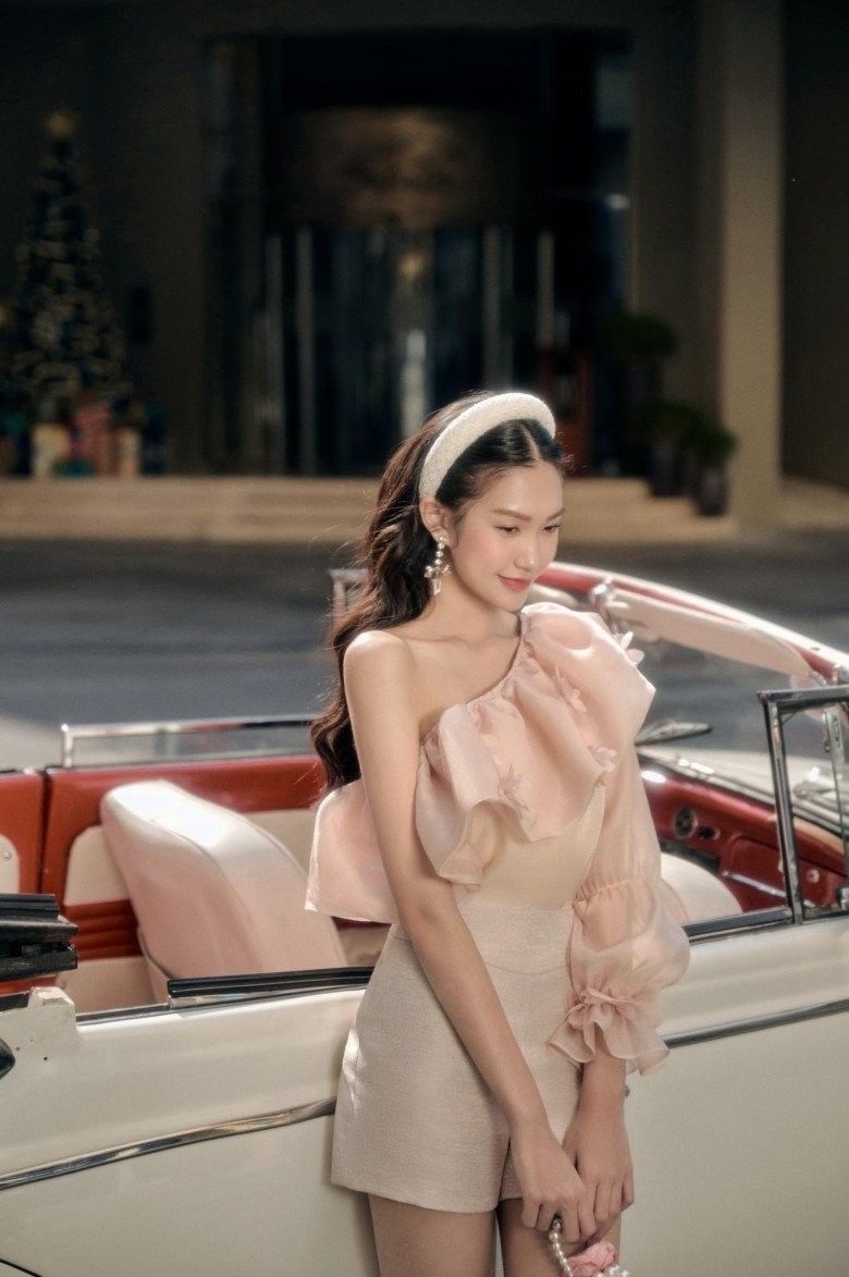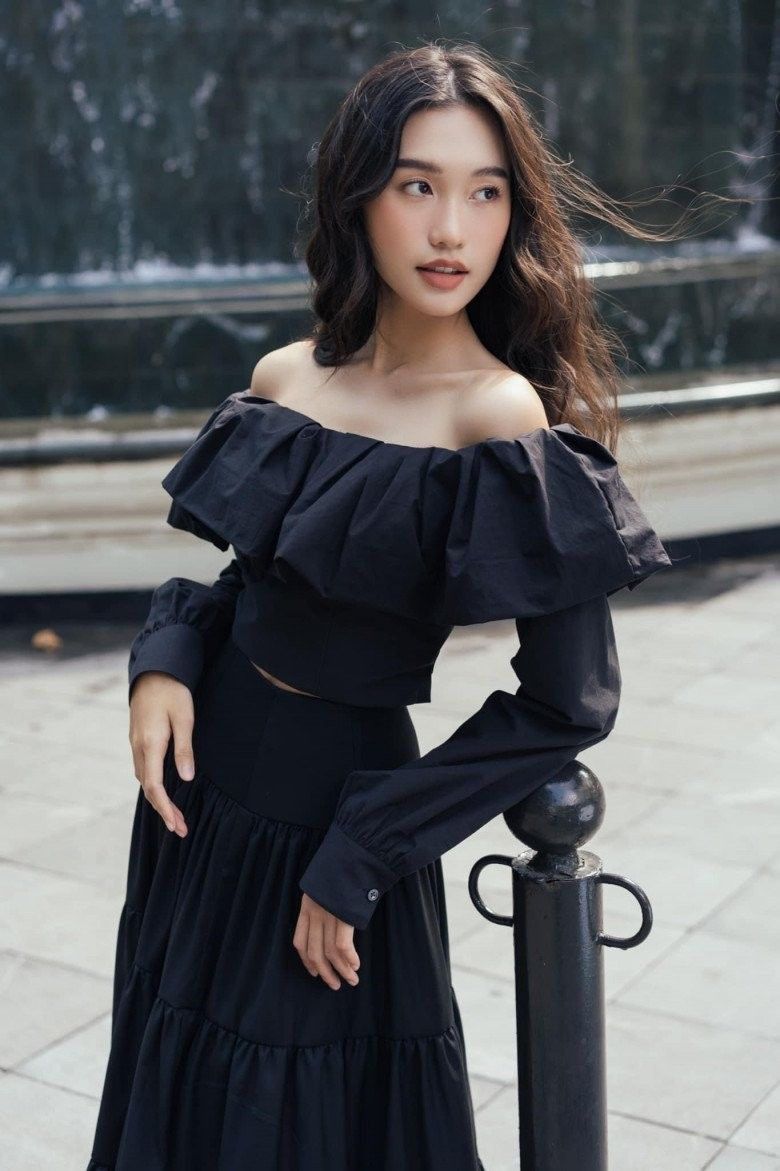 Váy trễ vai hờ hững và ngọt ngào giúp Hải My tạo dấu ấn đậm sâu với thời trang cơ bản.