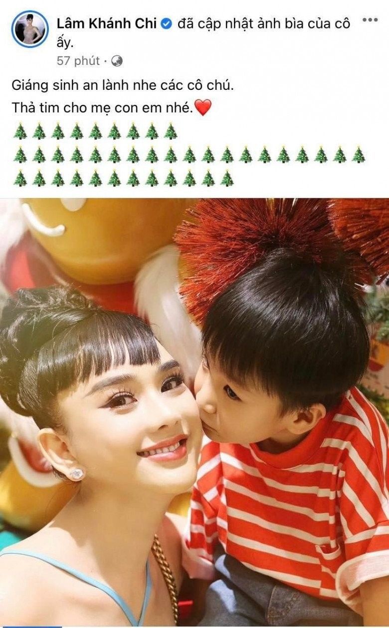 Về phía Lâm Khánh Chi, nữ ca sĩ chuyển giới chiếm sóng mạng xã hội khi khoe nhan sắc rạng rỡ bên cạnh con trai sau cuộc đại trùng tu trẻ hóa tốn tiền tỷ. Đối với Lâm Khánh Chi, cô rất chú trọng đến việc giữ gìn nhan sắc và không tiếc tiền để đầu tư vào vẻ ngoài. Ở tuổi 44, nữ ca sĩ được nhận xét là trẻ đẹp dù cuộc sống xảy ra không ít biến cố, gần đây nhất là việc ly hôn chồng. Một mình nuôi con, ngày Noel cô hạnh phúc khoe hình ảnh được quý tử hôn má kèm dòng trạng thái: “Giáng sinh an lành nhé các cô chú. Thả tim cho mẹ con em nhé!”.