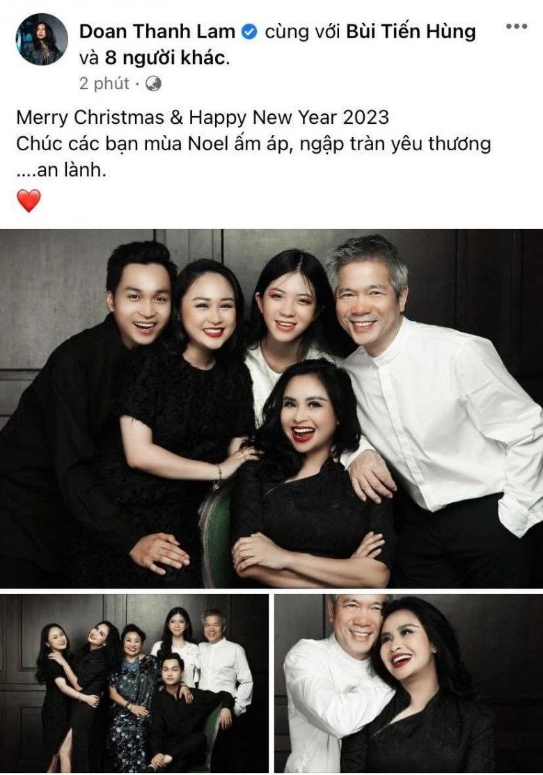 Diva Thanh Lam mừng giáng sinh bằng khoảnh khắc đầm ấm bên chồng và các con riêng với nhạc sĩ Quốc Trung. Cả nhà chọn trang phục đen, nhan sắc của nữ diva nổi bật và vẫn luôn thu hút tuyệt đối sự chú ý của khán giả. "Merry Christmas & Happy New Year 2023. Chúc các bạn mùa Noel ấm áp, ngập tràn yêu thương ….an lành", nữ diva chia sẻ.