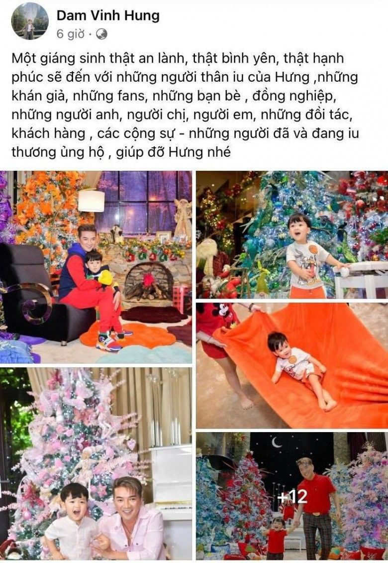 Ca sĩ Đàm Vĩnh Hưng cũng có ngày ngập tràn hạnh phúc bên con trai. Anh đăng tải nhiều ảnh của quý tử và viết dòng trạng thái: "Một giáng sinh thật an lành, thật bình yên, thật hạnh phúc sẽ đến với những người thân yêu của Hưng, những khán giả, những fans, những bạn bè, đồng nghiệp, những người anh, người chị, người em, những đối tác, khách hàng, các cộng sự - những người đã và đang yêu thương ủng hộ, giúp đỡ Hưng nhé".