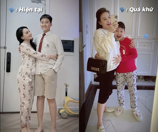 Nữ diễn viên cho biết chính bản thân còn ngạc nhiên vì sự phát triển chóng mặt của con trai. Mới năm ngoái, Đức Bảo (tên ở nhà là Bin) còn nhỉnh hơn mẹ một chút nhưng năm nay đã “trổ mã” cao vượt bậc, hiện hơn phụ huynh nửa cái đầu.