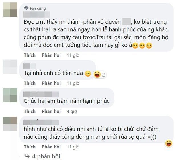 Tuy nhiên, cũng có nhiều khán giả thể hiện sự bức xúc trước những bình luận sân si: "Ngày vui của người ta, các bạn không chúc phúc được câu nào thì thôi im mồm đi. Vô duyên lại tưởng mình hài hước", "Người ta còn đang hạnh phúc thì cứ chúc mừng đi. Chưa gì đã có lũ vô duyên vào sân si kêu chia tay nọ kia rồi", "Mấy đứa ý kiến sân si là mấy đứa không hạnh phúc nên không muốn người ta hạnh phúc", "Đọc comment thấy nhiều thành phần vô duyên, không biết trong cuộc sống thất bại ra sao mà ngay hôn lễ hạnh phúc của người khác cũng phun được mấy câu toxic. Trai tài gái sắc, môn đăng hộ đối mà đọc comment tưởng tiểu tam hay gì không á"...