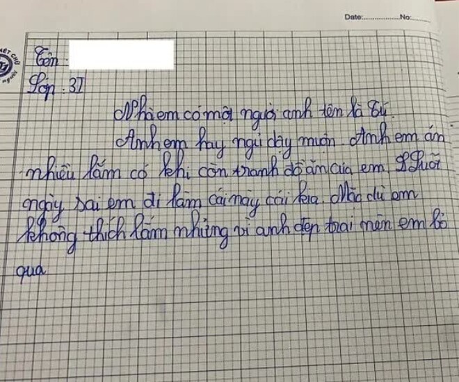 Mới đây, một bài văn tả anh trai của bé học sinh lớp 3 đã thu hút sự chú ý của các bậc phụ huynh. Chỉ vài dòng viết ngắn, nhóc tỳ đã cho thấy rõ mối quan hệ giữa hai anh em trong nhà. Tuy nhiên, đoạn “quay xe” ở kết bài mới là điểm nhấn khiến ai đọc bài văn cũng bật cười.