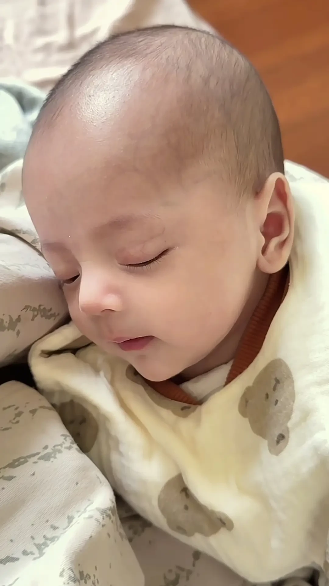 Người mẹ chụp nghiêng khuôn mặt con trai mình. Thông thường, đầu trẻ sơ sinh bị ép và méo tạm thời khi sinh thường, nhưng có thể bé này được sinh mổ nên đầu vẫn tròn và cân đối. Lúc đó, bé chưa có lông tơ hoặc đã được cạo sạch, khiến phần đầu trông tròn trịa, bóng bẩy - kiểu đầu mà các nhà sư trong phim truyền hình thường có.