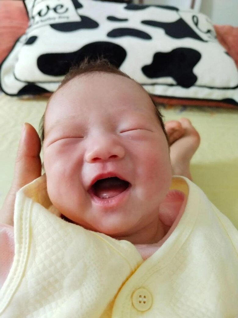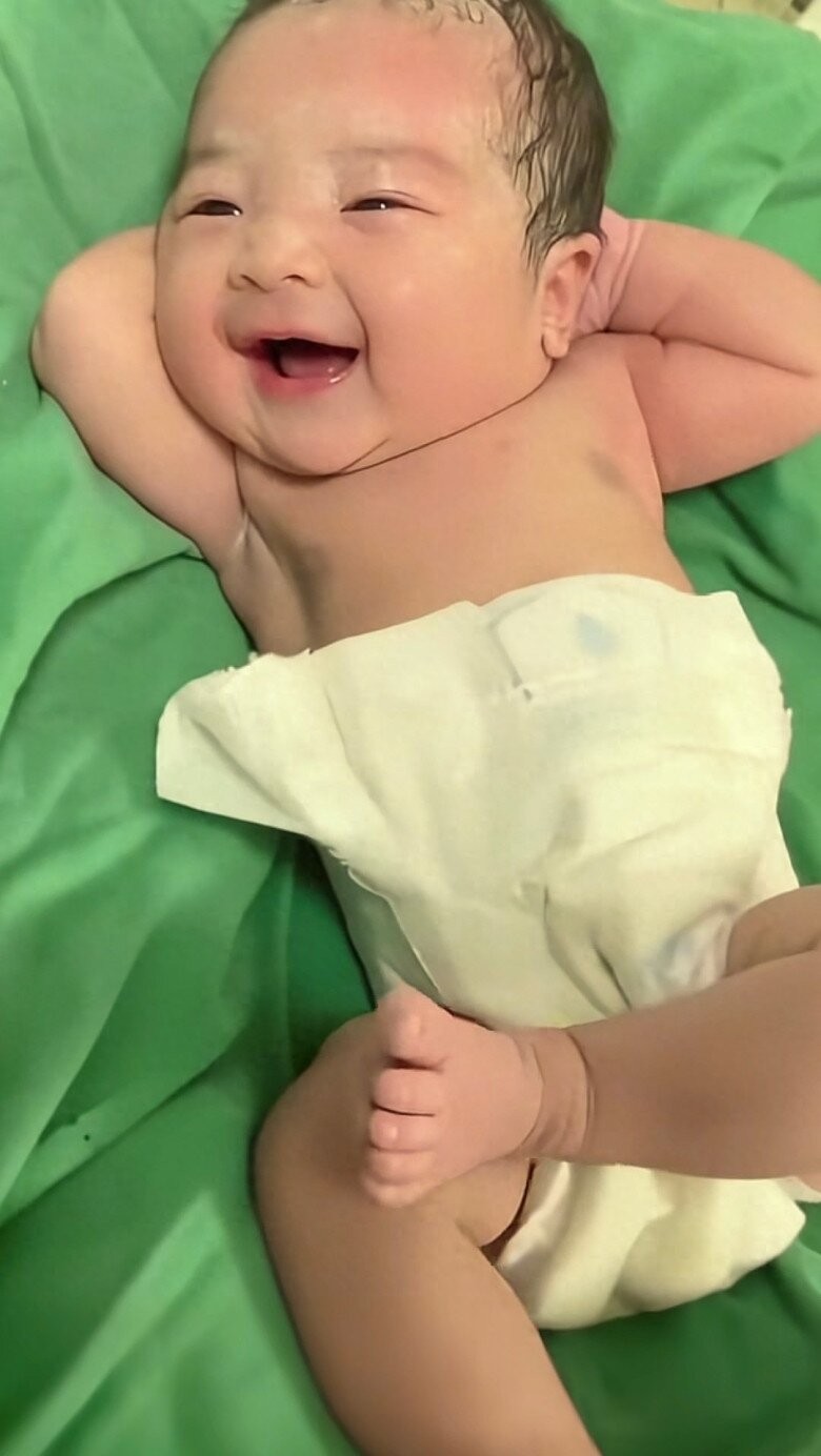 Nhóc tỳ mặc chiếc tả thùng thình, nở nụ cười tươi khiến ai nhìn cũng luỵ tim. Không những vậy, bé còn tạo dáng hệt như một thanh niên đang tán tỉnh bạn khác giới. Nhìn thấy cảnh tượng này, cả y tá và bác sĩ trong phòng sinh đều “dở khóc dở cười”, không ngờ đứa trẻ lại dễ thương đến vậy.