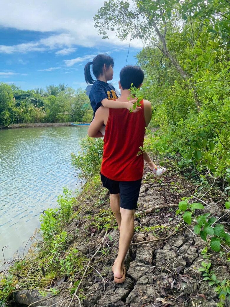 Khoảnh khắc Quách Ngọc Ngoan bế con gái khi đi thăm vườn ở quê nhà Cà Mau.