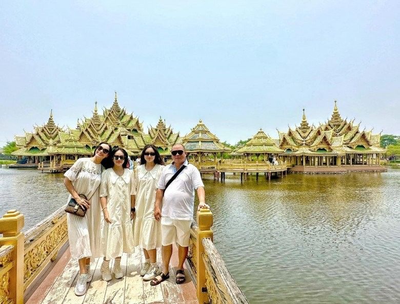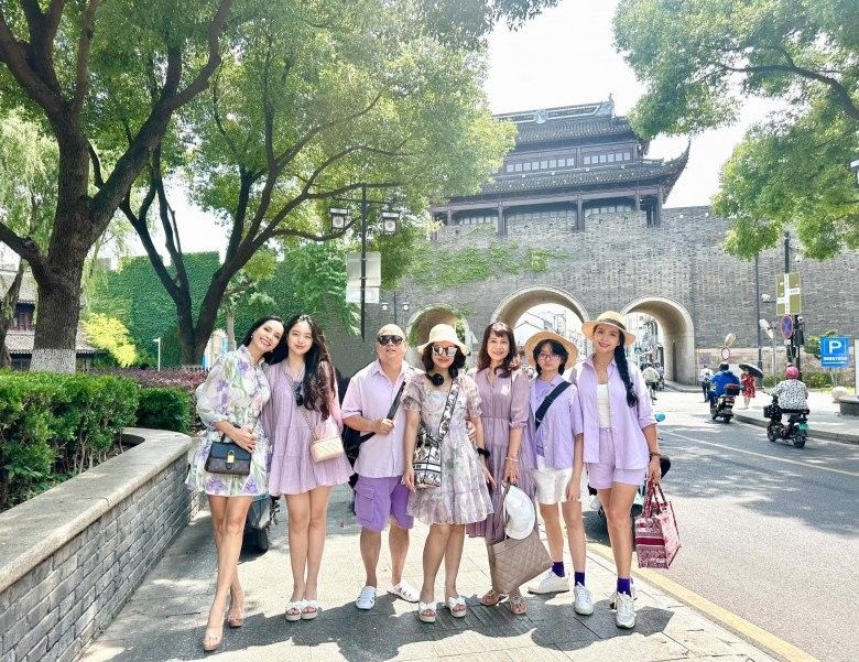 Gia đình nhỏ của Thuý Hạnh cùng đại gia đình có chuyến du lịch cùng nhau. Cả gia đình diện trang phục màu tím lilac nổi bật, trẻ trung.