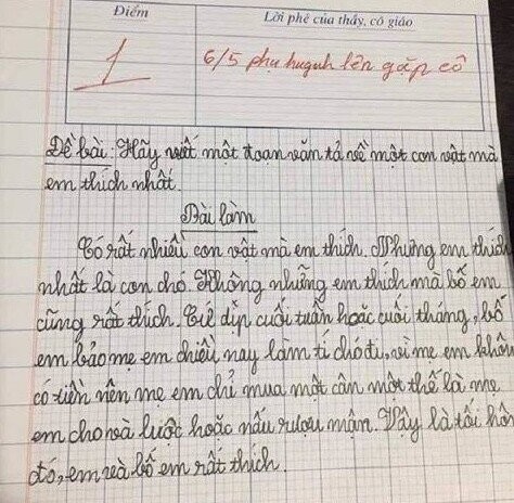 Đơn cử như trường hợp của một bé tiểu học viết văn tả con vật yêu thích. Mặc dù bài làm của nhóc tỳ tả rất chi tiết, nhưng sau khi cô giáo chủ nhiệm đọc xong liền ngay lập tức mời phụ huynh. Cụ thể, nhóc tiểu học đã viết: “Có rất nhiều con vật mà em thích. Nhưng em thích nhất là con chó. Không những em thích mà bố em cũng rất thích. Cứ dịp cuối tuần hoặc cuối tháng, bố em bảo mẹ em chiều nay làm tí chó đi, vì mẹ em không có tiền nên mẹ em chỉ mua 1 cân một, thế là mẹ em cho vào luộc hoặc nấu rượu mận. Vậy là tối hôm đó, em và bố em rất thích”.