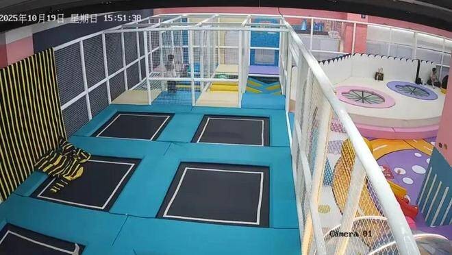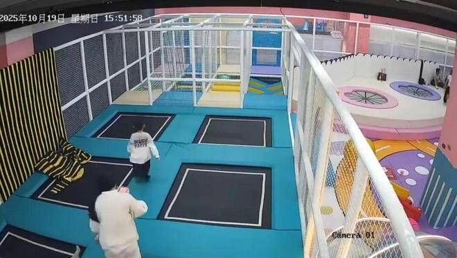 Đoạn video giám sát cho thấy, vào 15:49 ngày 19/10, hai đứa trẻ đang đuổi bắt nhau trong khu vực bạt lò xo. Đến 15:51, bé trai mặc đồ xanh lá cây bất ngờ ngồi xuống, sau đó loạng choạng đứng dậy rồi đi ra phía sau một trò chơi.