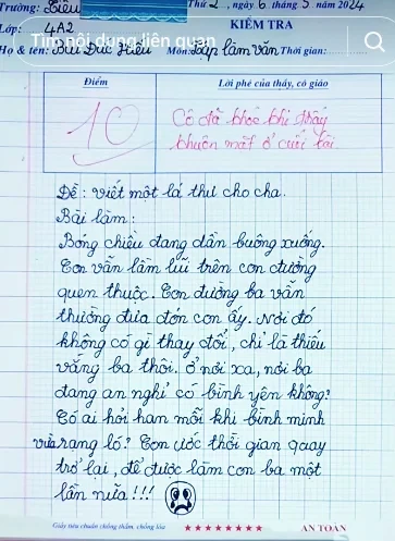 Cụ thể, khi nhóc tỳ được cô giáo giao đề tài viết một lá thư cho cha, dù chỉ vỏn vẹn một trang giấy với những nét chữ rõ ràng, ấy vậy mà đứa trẻ đã thành công lấy được điểm 10 tròn trĩnh từ cô giáo.