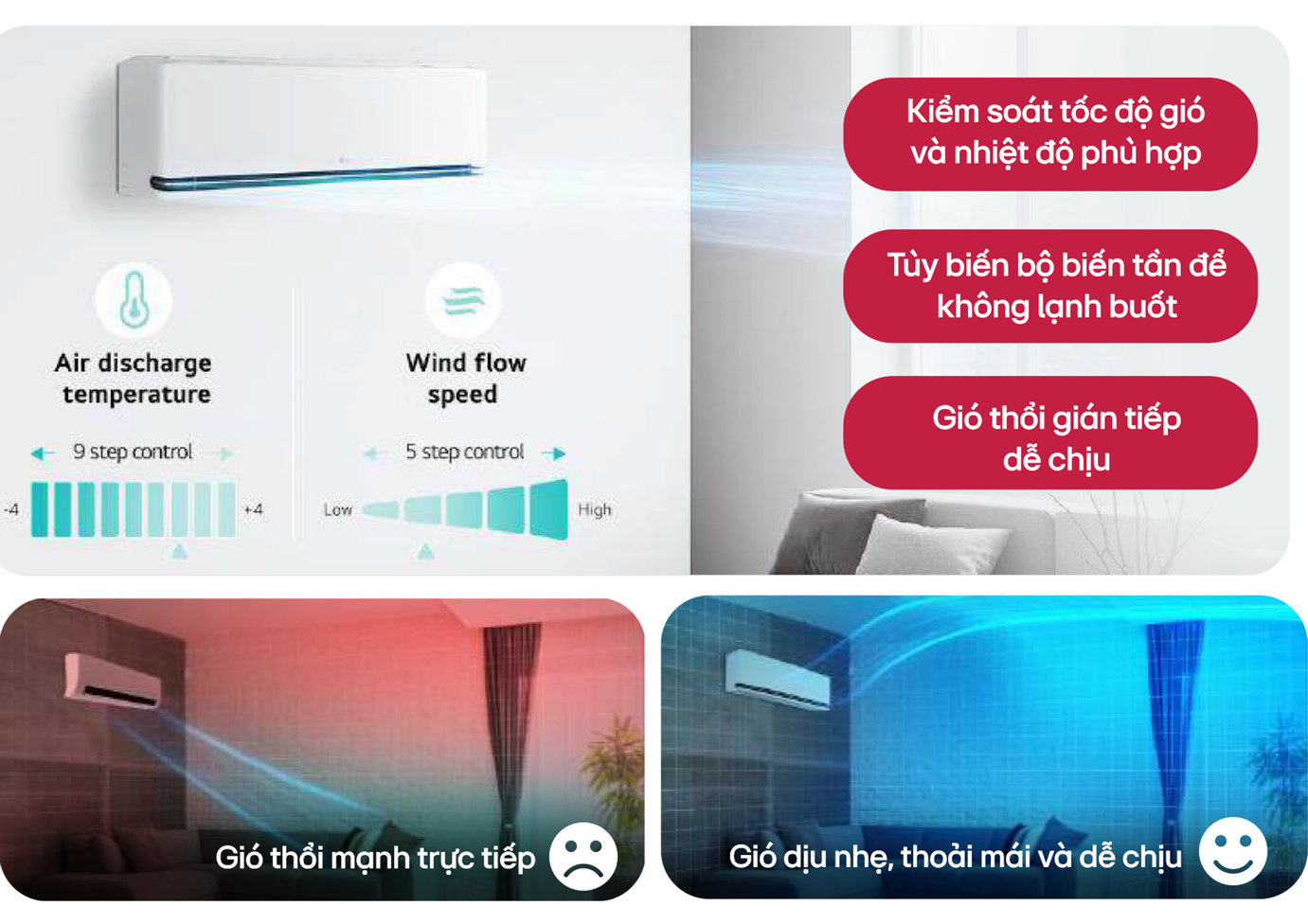 Điều chỉnh nhiệt độ và tốc độ gió linh hoạt, mang đến không gian mát dịu, không gây buốt lạnh nhờ chế độ Soft Air.