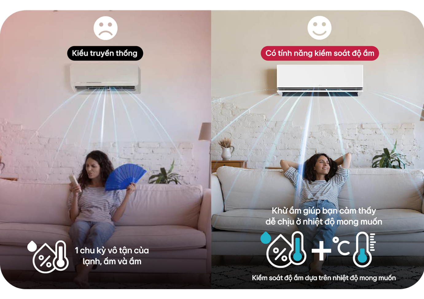 Ngoài ra, kiểm soát độ ẩm dễ chịu cũng là yếu tố quan trọng giúp LG DUALCOOL™ AI Air mang lại sự thoải mái dài lâu. Máy tích hợp cảm biến độ ẩm thông minh, giúp duy trì độ ẩm lý tưởng 50% - 65%, tránh không khí quá khô hoặc quá ẩm. Điều này đặc biệt quan trọng với người già và trẻ nhỏ, giúp bảo vệ hệ hô hấp và làn da ngay cả khi sử dụng điều hòa suốt nhiều giờ liên tục.