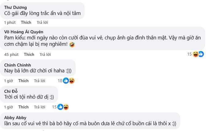 Hot mom Salim viết: "Tuổi này biết bướng rồi nhưng cũng buồn cười, hôm qua Pam bị mẹ nghiêm vì lí do ăn chậm. Nhấn mạnh là tôi chỉ nghiêm nhé chứ chưa có la, nên tôi kêu thôi bỏ khay cơm không được ăn nữa. Thế xong từ đó là những bước đi chậm rãi tiến đến bức hình gia đình, đứng ngắm rất lâu, tay chạm vào hình như đang muốn nói một điều gì đó.