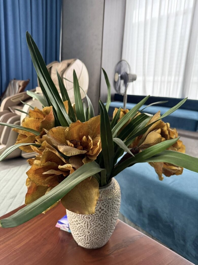 Bình hoa trang trí trong phòng khách được lựa chọn kỹ lưỡng với họa tiết cổ điển, kết hợp lá cùng những bông hoa màu vàng đồng, tạo điểm nhấn tinh tế.