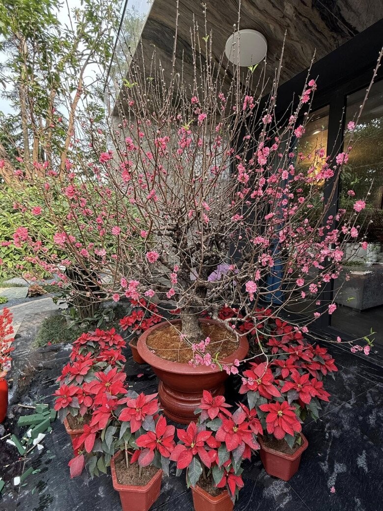 Góc sân trước được bài trí rực rỡ với cây đào nở rộ, những chậu trạng nguyên đỏ đầy sắc màu tươi tắn, đậm không khí mùa xuân.