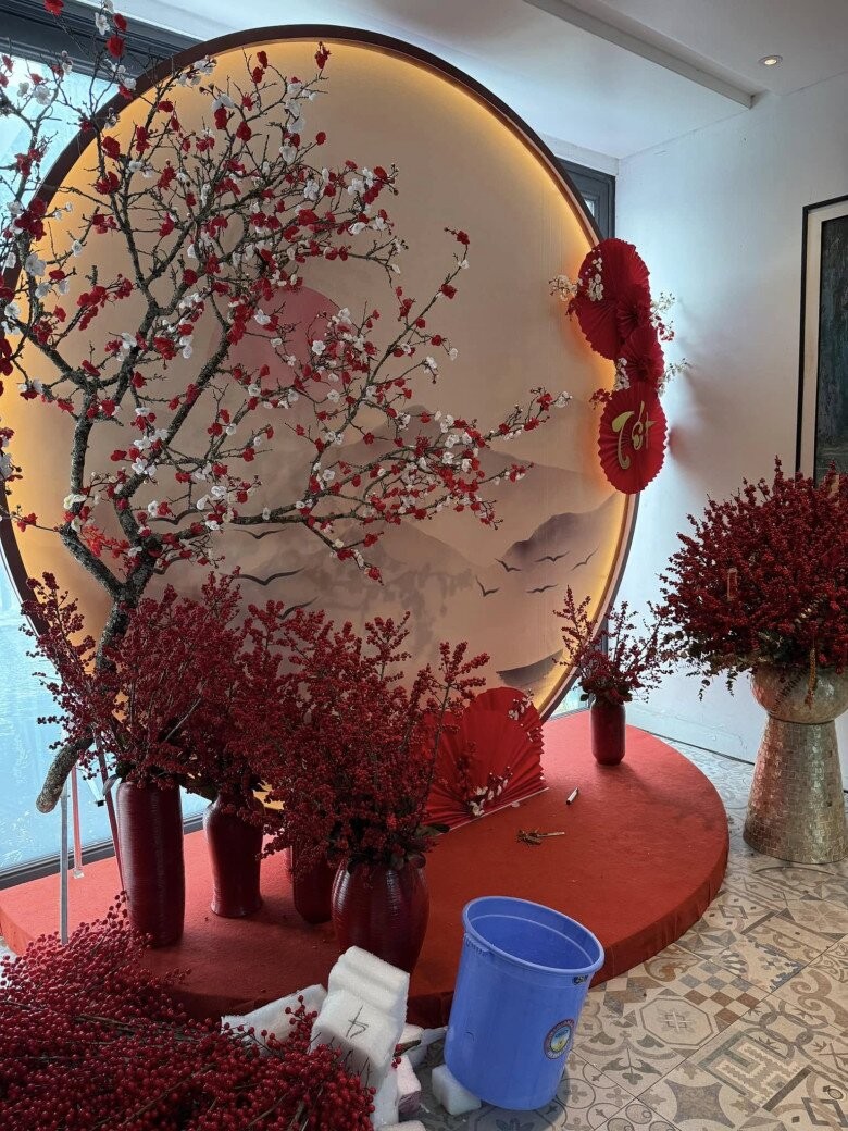 Khu vực trang trí Tết vừa qua trong nhà được thiết kế hoành tráng với chủ đề sắc đỏ chủ đạo. Bức tường tròn lớn với hiệu ứng ánh sáng mô phỏng mặt trời mọc, kết hợp cùng hoa đào đỏ, tạo nên khung cảnh đậm chất nghệ thuật.