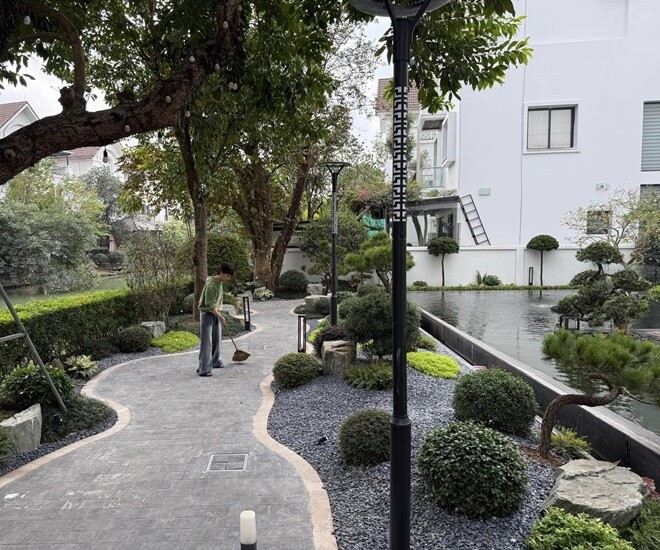 Cây xanh trong vườn được chăm sóc cẩn thận, với nhiều loại cây cổ thụ mang đến bóng mát tự nhiên. Hàng rào cây tỉa gọn gàng giúp biệt thự giữ được sự riêng tư nhưng vẫn hòa hợp với không gian xung quanh.