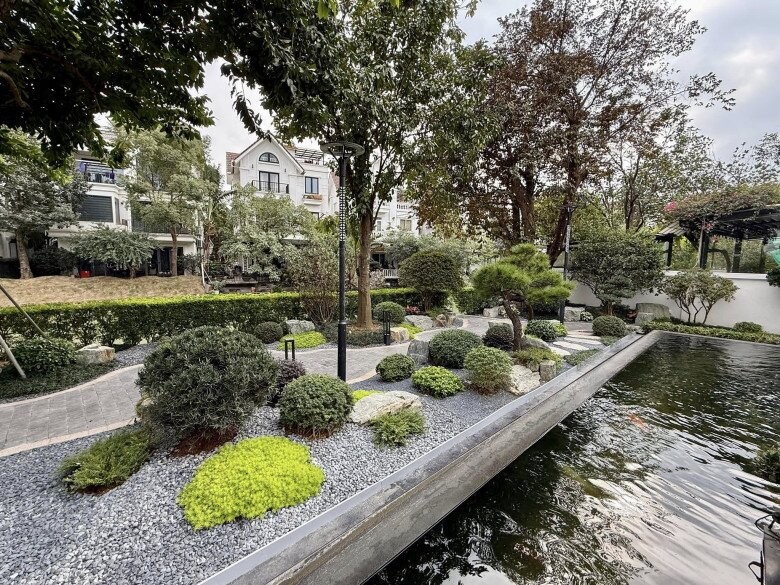 Hồ cá Koi lớn được thiết kế dọc theo khu vườn, làm nơi thư giãn và tạo phong thủy tốt cho biệt thự. Sự kết hợp giữa mặt nước, cây xanh và đá cảnh giúp không gian trở nên cân đối, gần gũi với thiên nhiên.