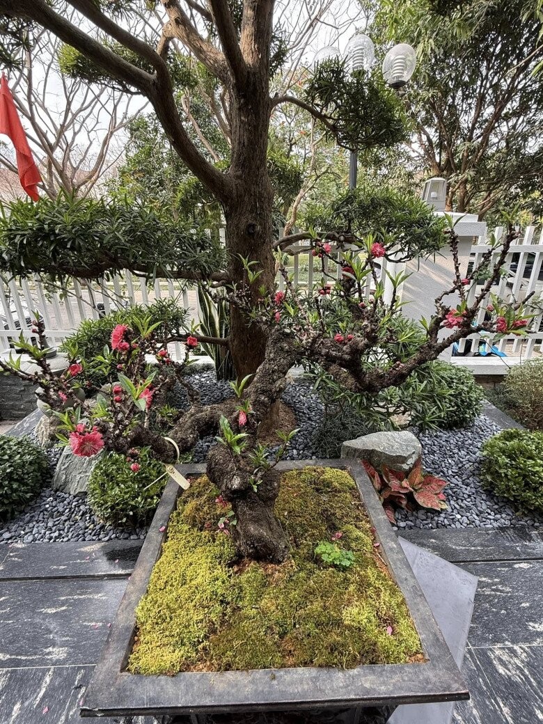 Chậu đào thế được đặt trang trọng trong khuôn viên sân vườn, kết hợp với lớp rêu xanh phủ trên bề mặt đất tạo nên vẻ đẹp tự nhiên và phong thái vững chãi, phù hợp với không gian biệt thự sang trọng.