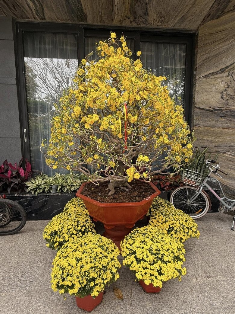 Một chậu mai dáng bonsai được cắt tỉa công phu, nở rộ với sắc vàng rực rỡ, kết hợp cùng các chậu cúc vàng xếp xung quanh, mang lại sự hài hòa về màu sắc và ý nghĩa may mắn trong năm mới.