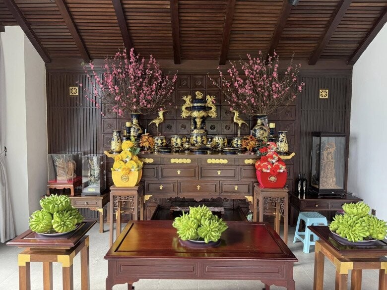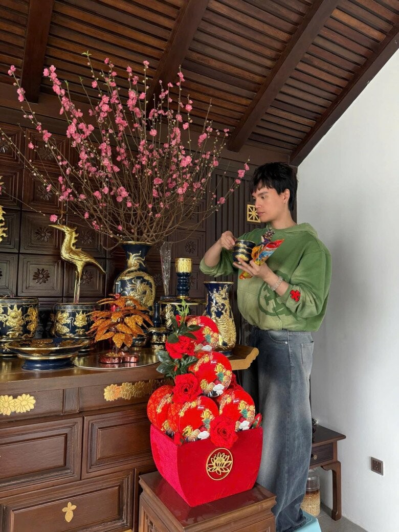 Nguyễn Trần Trung Quân sắp xếp lại bàn thờ gia tiên, bài trí những món đồ thờ cúng với sự trang trọng. Các họa tiết chạm trổ trên tủ thờ kết hợp cùng hoa đào tạo nên không gian linh thiêng, mang đậm giá trị truyền thống.
