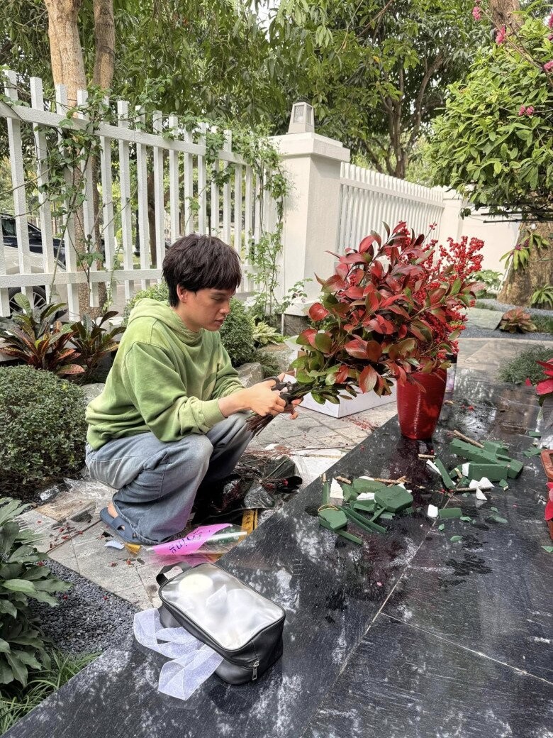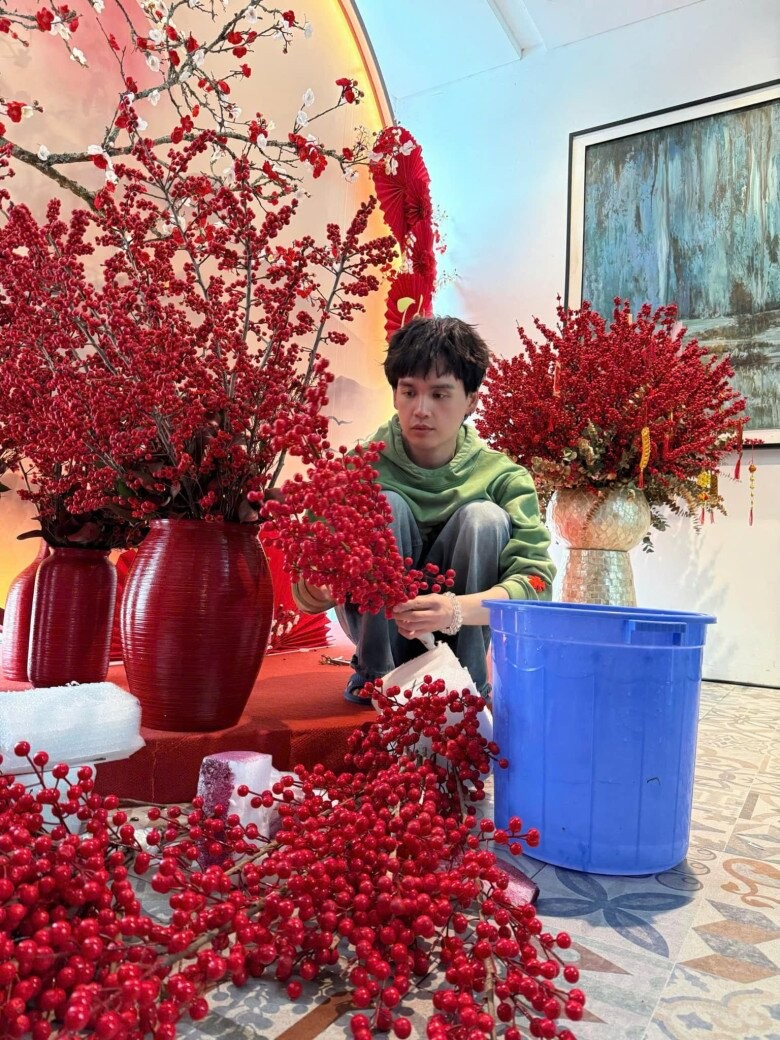 Nguyễn Trần Trung Quân trang trí lại nhà cửa với hoa lá tươi mới. Sự kết hợp giữa cành lá đỏ rực và bình gốm truyền thống làm nên nét nổi bật cho không gian sống.