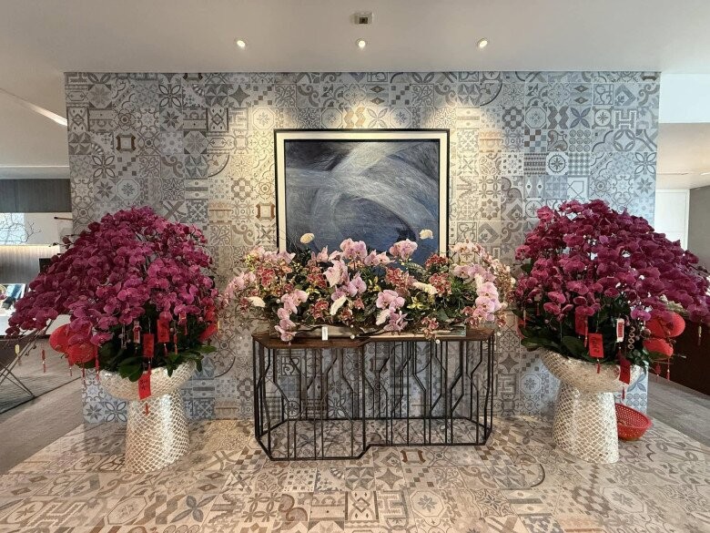 Không gian sảnh được trang hoàng với những chậu lan hồ điệp đặt trên bệ sứ hoa văn tinh xảo. T tranh nghệ thuật giúp căn phòng vừa sang trọng vừa có chiều sâu thẩm mỹ.