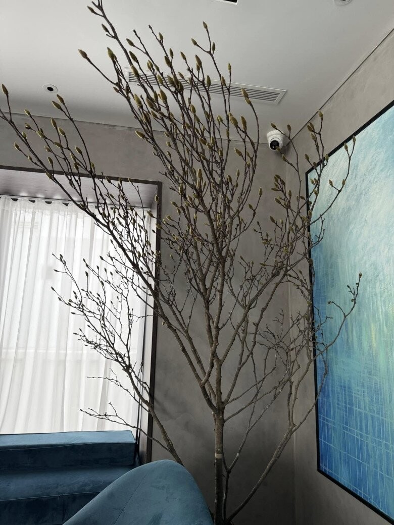 Nhánh hoa mộc lan lớn được đặt trong phòng khách, mang vẻ đẹp tự nhiên nhưng vẫn hiện đại. Sự kết hợp giữa màu xanh của sofa, bức tranh trừu tượng và bức tường bê tông giúp không gian trở nên thanh lịch và có chiều sâu.
