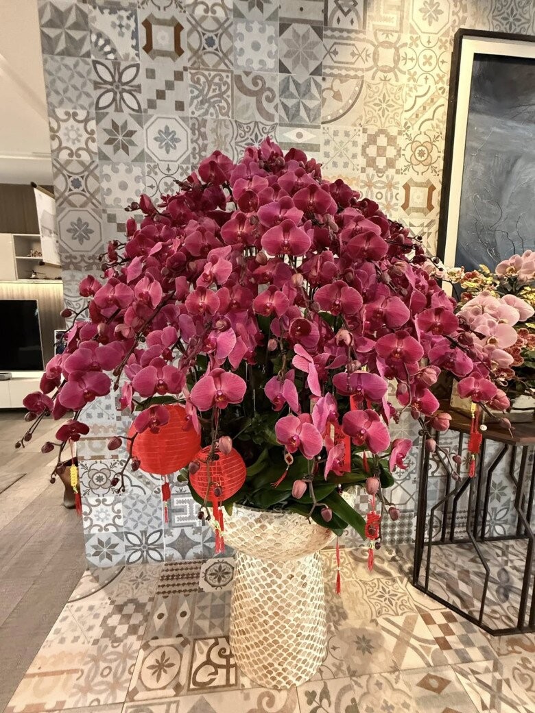 Chậu lan tím cỡ lớn bài trí ở khu vực trung tâm phòng khách, đi kèm các phụ kiện trang trí như lồng đèn đỏ, nổi bật giữa nền gạch bông hoa văn cổ điển.