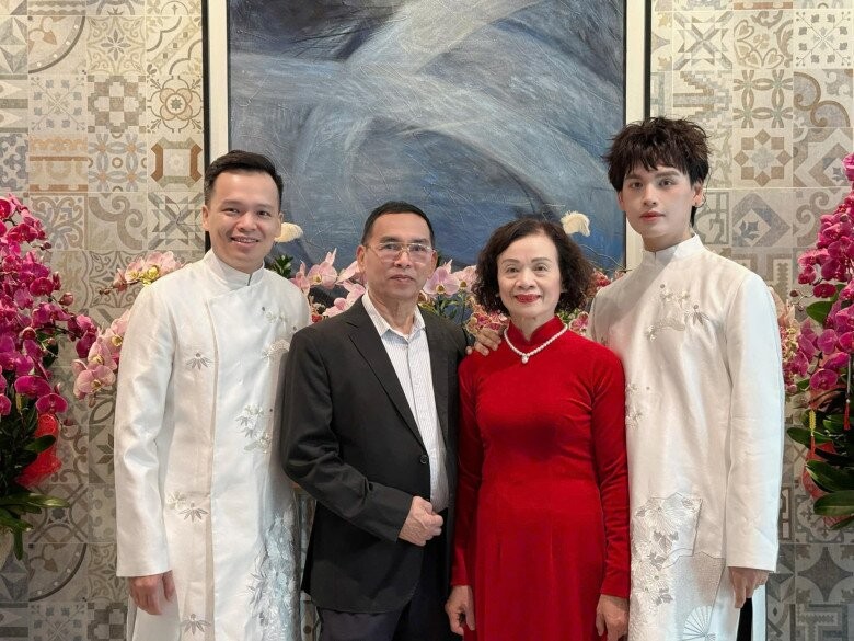 Gia đình nam ca sĩ sum vầy bên nhau trong ngày Tết, phía sau là những chậu hoa lan rực rỡ, cùng nền tường gạch bông cổ điển, khung cảnh trang trọng nhưng vẫn ấm cúng.