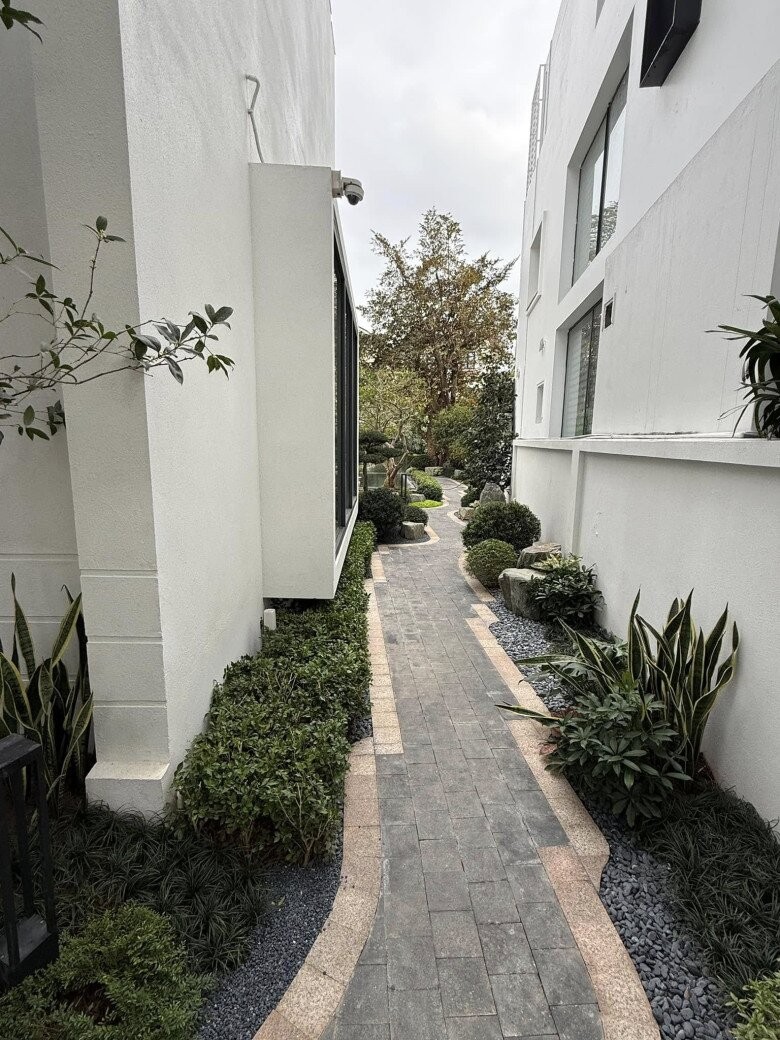 Hành lang bên hông nhà được tận dụng làm đường dạo bộ với cây xanh cắt tỉa gọn gàng, lát đá kết hợp sỏi trắng và xám giúp thoát nước tốt, giữ cho khu vực này luôn sạch sẽ, khô ráo.