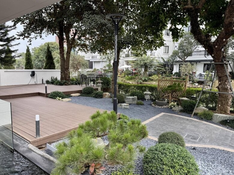 Khu vườn của gia đình Nguyễn Trần Trung Quân được thiết kế theo phong cách Nhật Bản với lối đi lát đá uốn lượn, kết hợp tiểu cảnh cây tỉa bonsai, đá tự nhiên và sỏi xám tạo nên tổng thể hài hòa, mang đến không gian thư giãn lý tưởng.