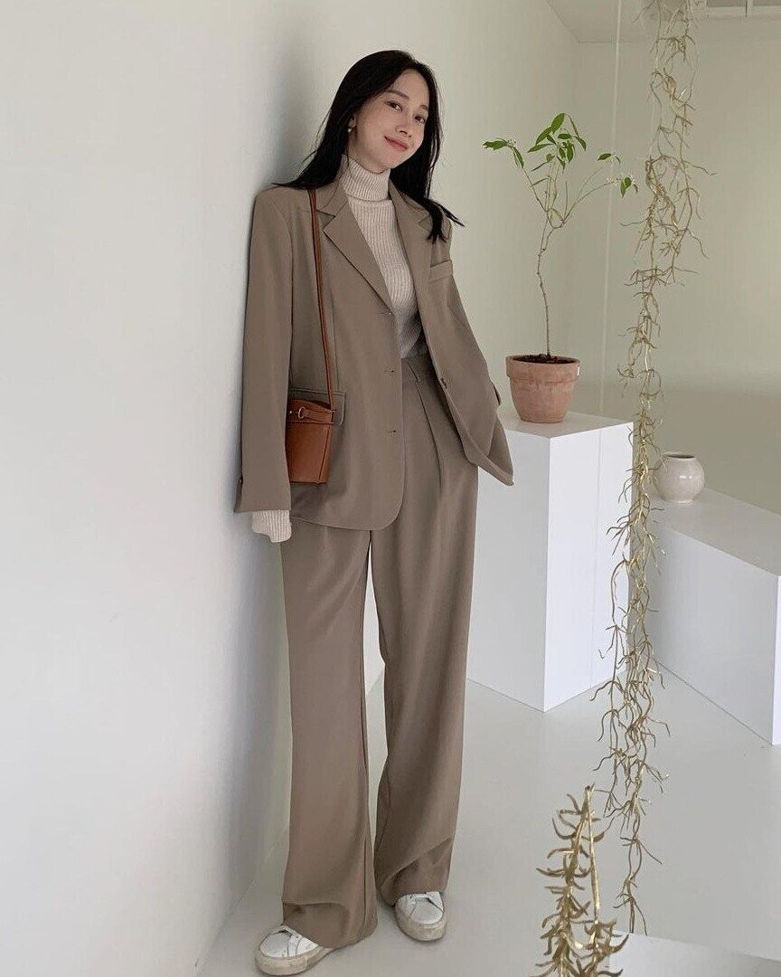 Phối blazer và quần âu cùng tông hoặc gần tông màu giúp tổng thể trông liền mạch và sang sủa hơn. Cách phối này đặc biệt phù hợp với phong cách tối giản, bởi không cần nhiều chi tiết nhưng vẫn tạo hiệu ứng thị giác rất tốt.
