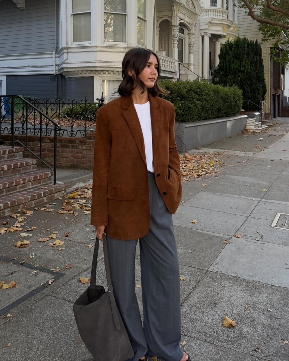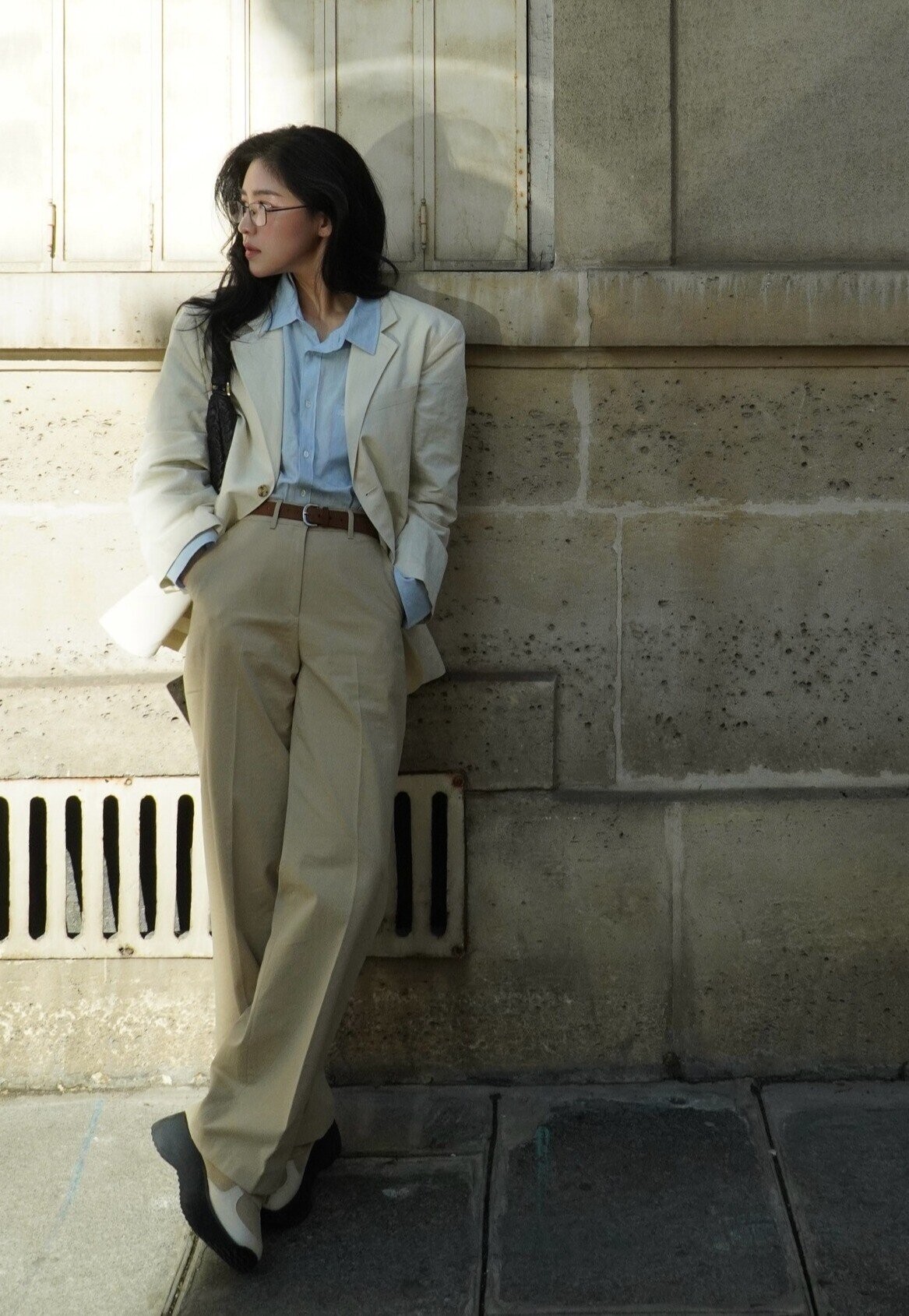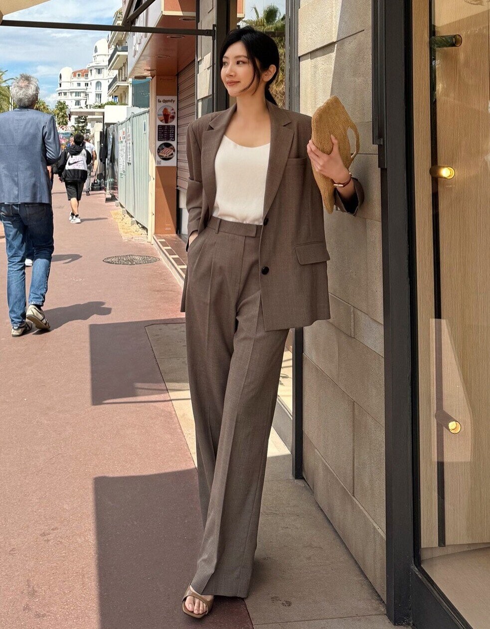Phối blazer và quần âu cùng tông màu tạo hiệu ứng liền mạch, sang ngầm. Set đồ tối giản nhưng có chiều sâu, phù hợp phong cách công sở hiện đại.