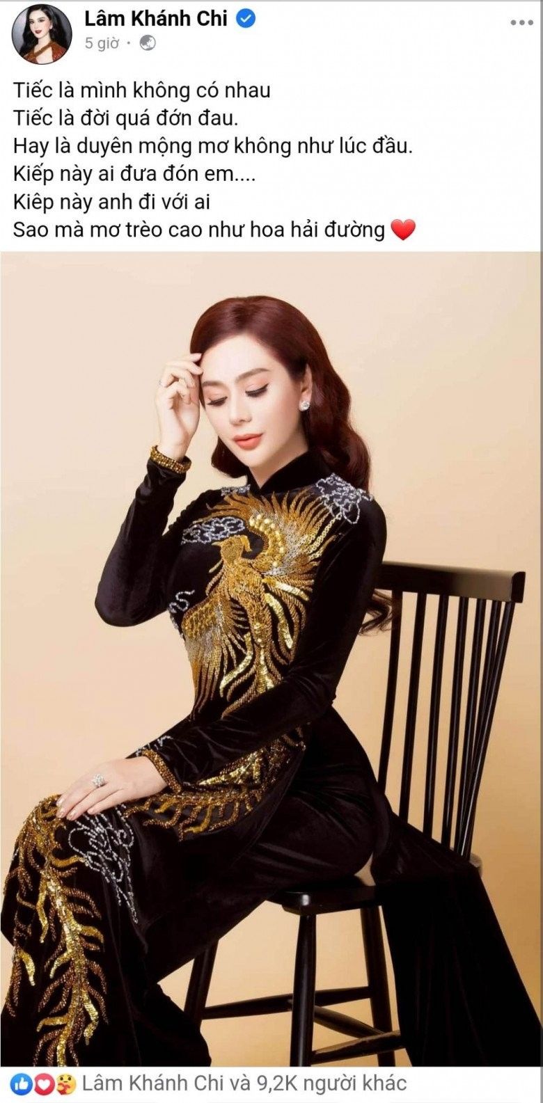 Cụ thể, trên trang cá nhân, "công chúa" đăng tải bức ảnh thả dáng trong bộ áo dài truyền thống đính chim phượng thướt tha. Kèm theo đó, cô viết dòng trạng thái là lời bài hát Hoa hải đường: "Tiếc là mình không có nhau, tiếc là đời quá đớn đau, hay là duyên mộng mơ không như lúc đầu. Kiếp này ai đưa đón em, kiếp này anh đi với ai, sao mà mơ trèo cao như hoa hải đường". Ca từ xót xa trên khiến người xem cho rằng Lâm Khánh Chi đang ẩn ý về chuyện tình dang dở với chồng cũ.