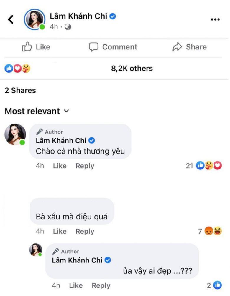 Đối diện với lời nhận xét ác ý, thay vì nổi giận, Lâm Khánh Chi dí dỏm đáp: "Ủa vậy ai đẹp?". Bên dưới, không ít người lên tiếng bảo vệ nữ ca sĩ chuyển giới, cho rằng bình luận trên quá kém duyên, thiếu tế nhị.