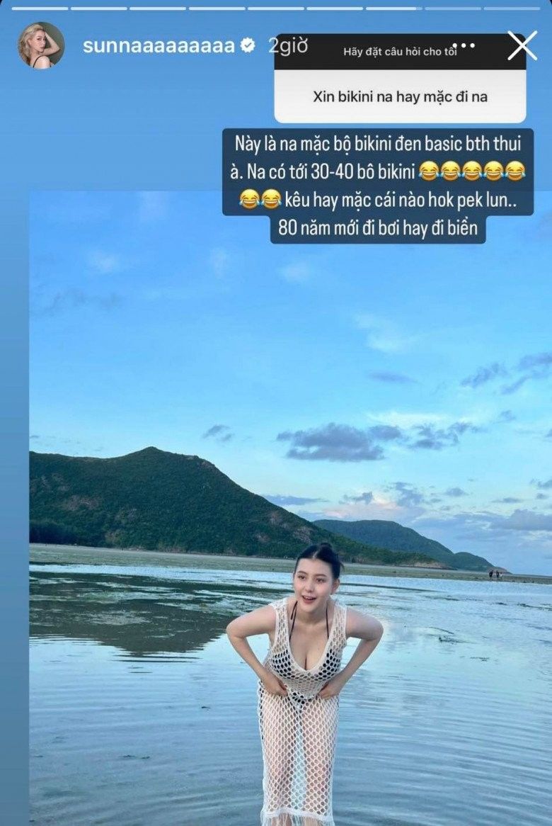 Ngay khi hình ảnh này được đăng tải, dân tình ai nấy đều quan tâm đến outfit đi biển mà Sunna chọn diện. Bên cạnh đó, cô nàng còn "gây sốt" khi tiết lộ trong tủ đồ của mình có đến tận 30 - 40 bộ áo tắm mặc dù rất hiếm khi đi biển.