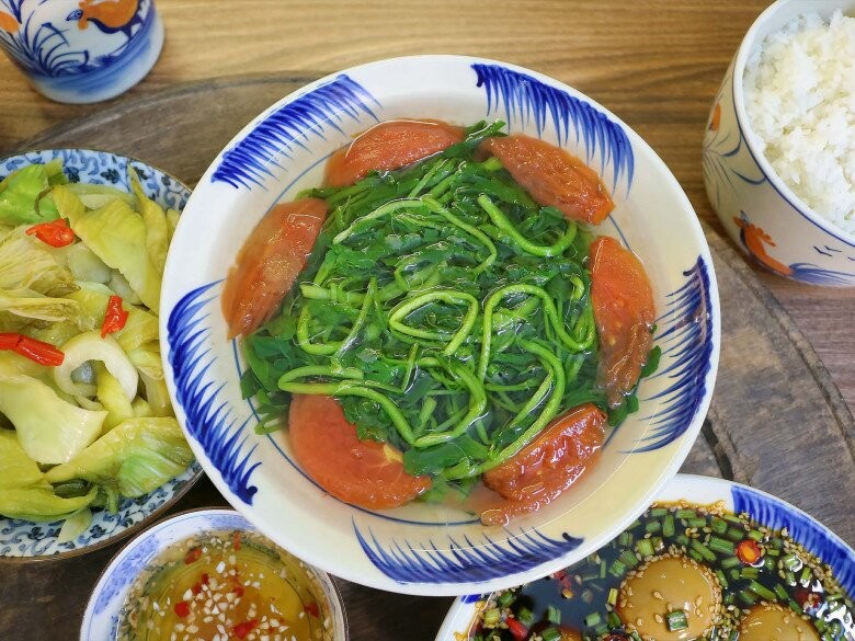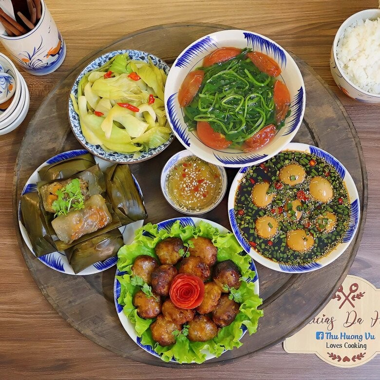 Mâm cơm giản dị nhưng đầy đủ hương vị, kết hợp hài hòa giữa món mặn, món ăn chơi và canh thanh mát. Chả viên nướng thơm lừng, vàng ruộm ăn kèm trứng ngâm tương đậm đà, béo bùi. Bánh bột lọc dẻo dai, nhân đậm vị tạo điểm nhấn dân dã, gần gũi. Dưa cải chua nhẹ giúp cân bằng vị giác, còn bát canh rau cải xoong thanh mát khép lại bữa ăn nhẹ nhàng, tròn vị - rất hợp cho một bữa cơm nhà ấm cúng.