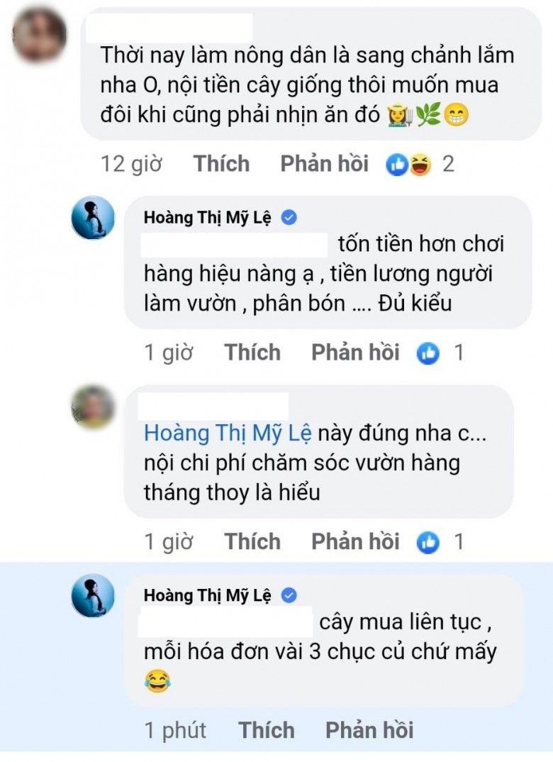 Nhiều người còn ước được làm nông dân như Mỹ Lệ mà không có đất, có người cho rằng "thời nay làm nông dân là sang chảnh lắm", vì nhiều khi phải tốn tiền mua cây giống. Nữ ca sĩ thừa nhận: "Tốn tiền hơn chơi hàng hiệu, tiền lương người làm vườn, phân bón... đủ kiểu", "Cây mua liên tục, mỗi hóa đơn vài ba chục củ chứ mấy"...