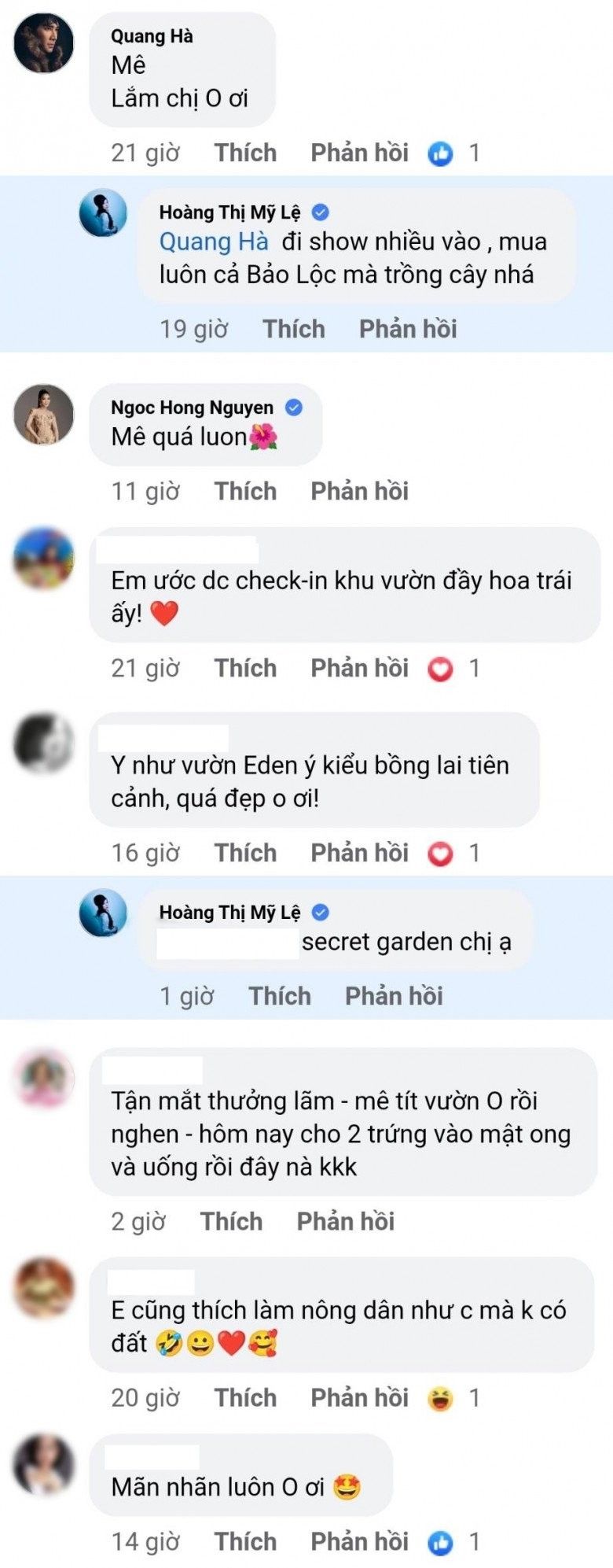 Nhìn những hình ảnh cô khoe, nhiều người nổi tiếng như Quang Hà, Hồng Ngọc và hàng loạt người hâm mộ phải xuýt xoa: "Mê quá luôn", "Y như vườn Eden ý, kiểu bồng lai tiên cảnh, quá đẹp o ơi", "Khu vườn địa đàng", "Em ước được check-in khu vườn đầy hoa trái ấy!", "Tận mắt thưởng lãm, mê tít vườn o rồi nghen"...
