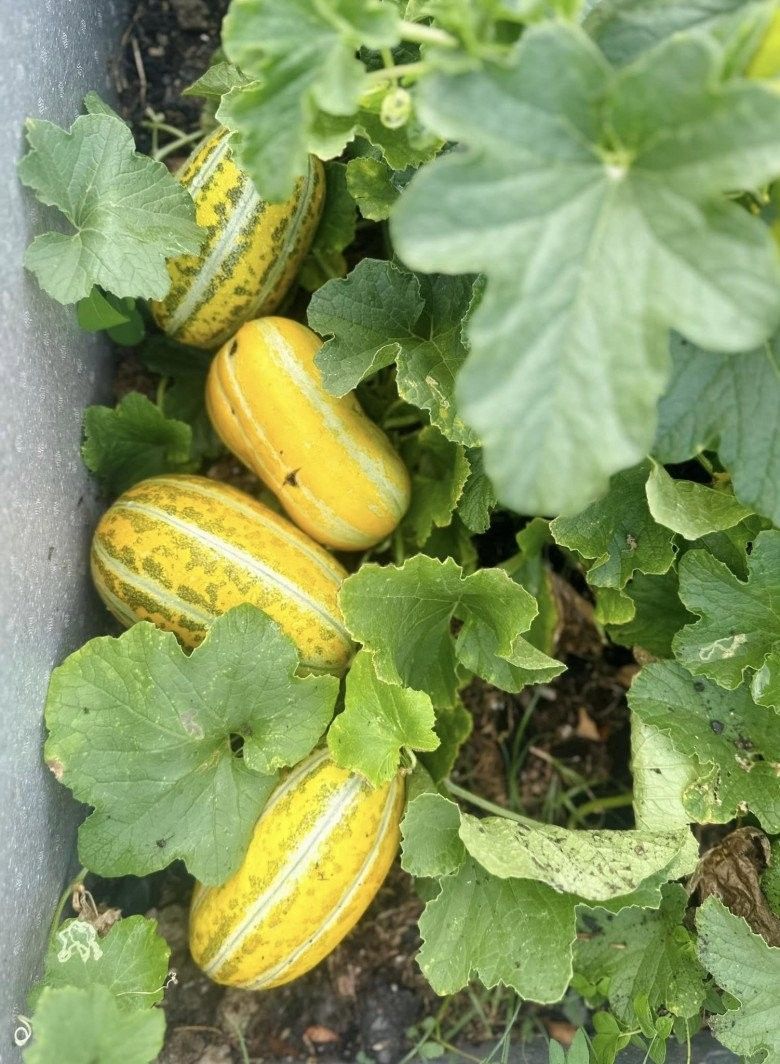 Trong vườn, nữ ca sĩ trồng rất nhiều rau củ quả, cây ăn trái. Cô cho biết những trái dưa này chín cây, ai nhìn cũng thấy "sướng con mắt".