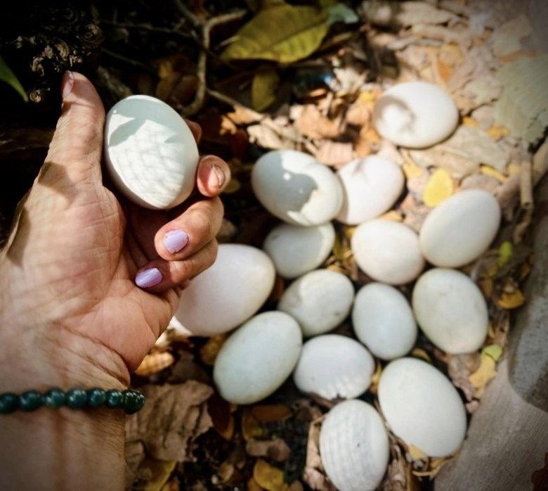 Bên cạnh trồng cây, gia đình Mỹ Lệ còn nuôi các con vật trong trang trại hàng nghìn m2 của mình. Cô khoái chí thu hoạch trứng.